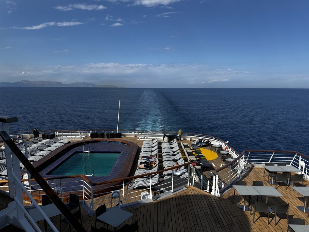 Este moderno barco combina comodidad y autenticidad, ofreciendo un ambiente acogedor con el toque cálido de la hospitalidad griega. A bordo encontrarás restaurantes con cocina mediterránea e internacional, bares con música en vivo, spa, gimnasio, piscina y espacios diseñados para el descanso y la diversión.